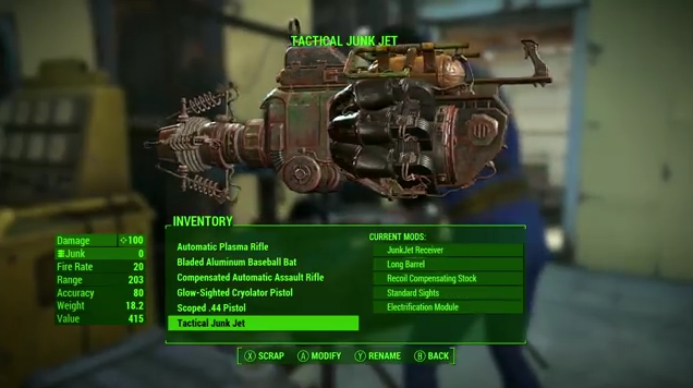 Fallout: New Vegas had two glaring absences in the gun department – the Railway Rifle and the Rock-It Launcher, both from Fallout 3. The Rock-It Launcher was a personal favorite, because somehow taking somebody’s head off with a coffee mug just never gets old. Thankfully, footage from Fallout 4 seems to indicate a possible return for the Rock-It Launcher, but under the new moniker Junk Jet (see photo above). Here’s to hoping that with some modifications, we can all make Junk Jet Sniper Rifles and decapitate a raider with a clipboard from 700 ft away.