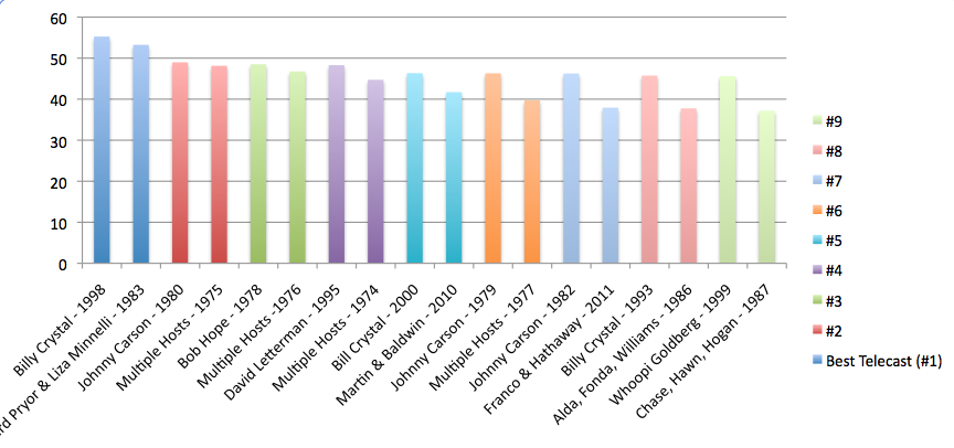 Women aren’t too far behind men, but overall they do come up a bit shy. Liza Minelli is the only one to match the men’s numbers, but she also co-hosted with Dudley Moore, Richard Pryor, and Walter Matthau. If you disregard that year, then Whoopi is the closest with 45.6 million viewers compared to David Letterman’s 48.27 in 1995. Unfortunately, the results are pretty skewed by the disparity between the number of female hosts compared to the number of male hosts. Maybe a better comparison is the Golden Globes – where Amy Poehler and Tina Fey easily beat Ricky Gervais over the past six years. We can’t get a totally accurate picture of men vs. women until (hypothetically) women host an equal amount of Oscar nights as men.