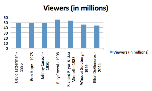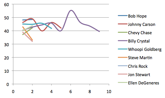 From 1974 – 2015 there has been a total of 9 returning hosts: Bob Hope, Johnny Carson, Chevy Chase, Billy Crystal, Whoopi Goldberg, Steve Martin, Chris Rock (as of this upcoming year) Jon Stewart, and Ellen DeGeneres. Let’s see how it plays out if we plot a graph using the numbers of viewers during each of their years hosting.