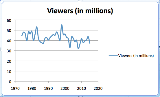 To keep this article from running 5000 words and also due to a lack of information about the Emmys and Globes, this post will look specifically at the Academy Awards. Wikipedia lists the number of viewers since 1974, so that’s how far back we’ll go. Here’s a simple graph to start, showing how the number of viewers has fluctuated each year: